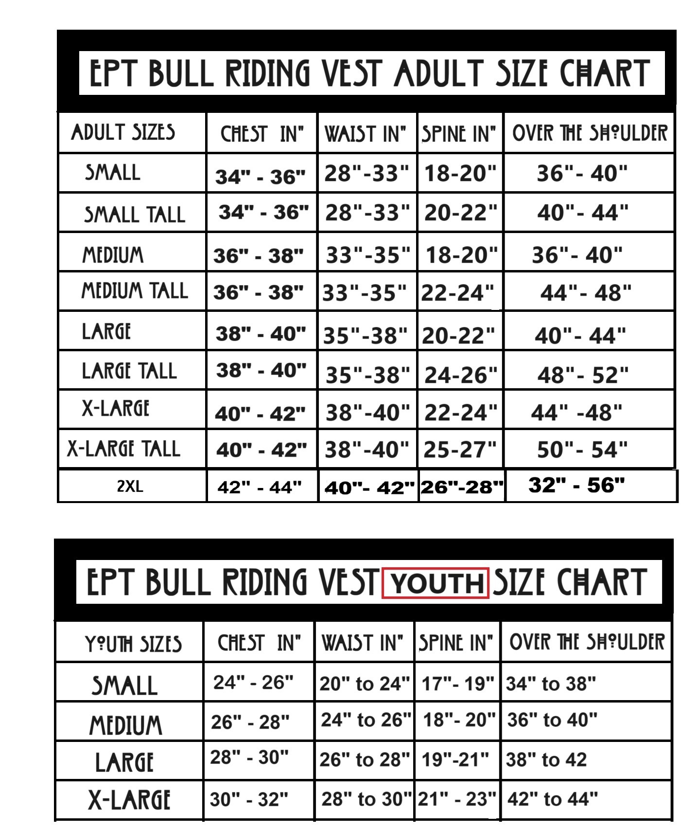 Youth-specific sizes and styles available for younger riders, including vests with neck braces or rolls to bolster protection. EPT Bull Ropes